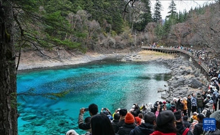 11月16日,游客在九寨溝景區(qū)五彩池觀光。