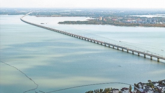 11月23日,蘇州吳江區(qū),滬蘇湖高鐵試運(yùn)行列車(chē)跨過(guò)元蕩。 袁新宇 周悅磊 攝 (視覺(jué)江蘇網(wǎng)供圖)