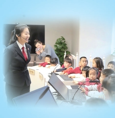 北京三中院組織開(kāi)放日活動(dòng),法院干警(左一)為前來(lái)參觀的“小客人”介紹少年法庭。馬國(guó)強(qiáng)攝