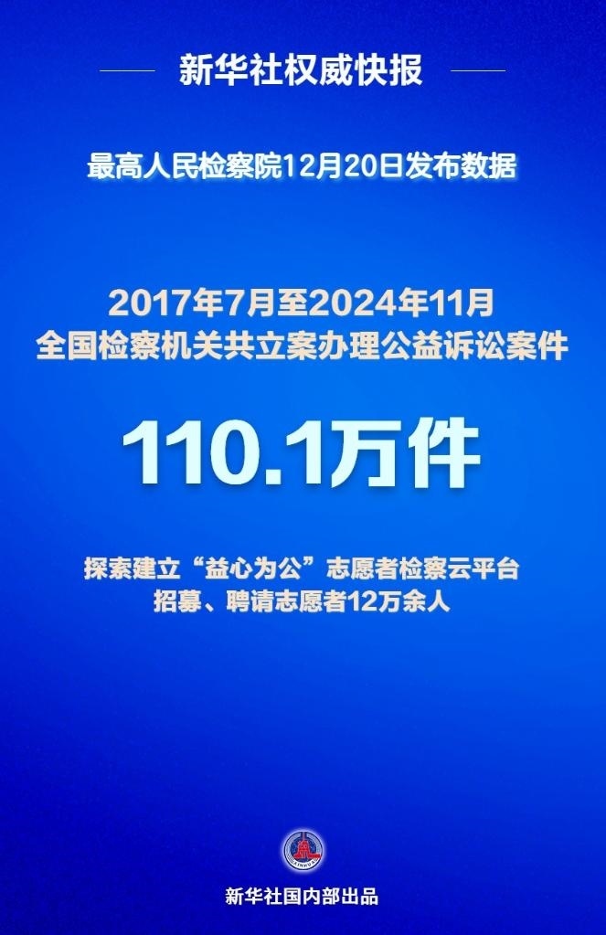 最高人民檢察院12月20日發(fā)布檢察公益訴訟有關(guān)情況顯示,2017年7月至2024年11月,全國(guó)檢察機(jī)關(guān)共立案辦理公益訴訟案件110.1萬(wàn)件,其中行政公益訴訟案件98.9萬(wàn)件,民事公益訴訟案件11.2萬(wàn)件。