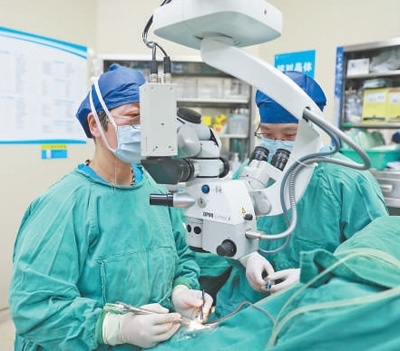 湖南省湘潭市中心醫(yī)院眼科主任謝梅芬(左)在進(jìn)行人工晶體植入手術(shù)。