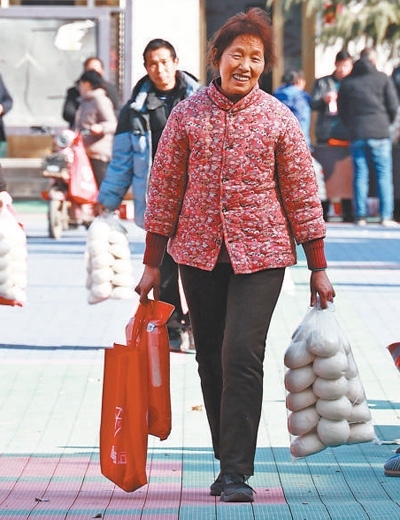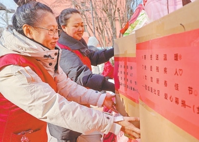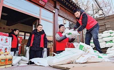 山東省青州市,工作人員將走訪慰問困難群眾的愛心年貨裝車。
