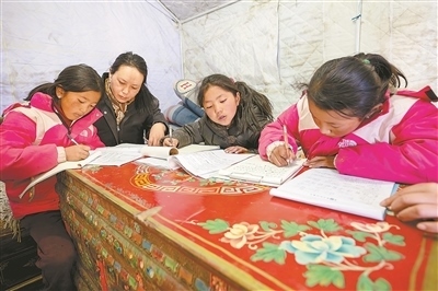 西藏自治區(qū)日喀則市薩迦縣普村的安置點內,黨員次央(左二)在輔導村里的小朋友寫作業(yè)。