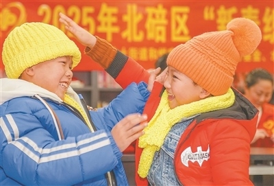 重慶市北碚區(qū)水土街道和悅家園社區(qū),困境兒童穿戴著志愿者贈送的帽子和圍巾在玩耍。