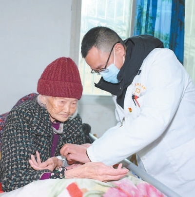 四川省眉山市丹棱縣仁美鎮(zhèn)雄義村,村醫(yī)徐遠利(右)為92歲的張玉珍測量血壓。
