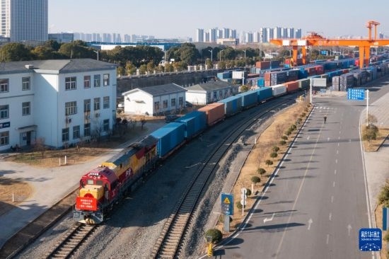 1月29日,滿載集裝箱的中歐班列駛離南京鐵路物流中心堯化門站貨場(無人機(jī)照片)。