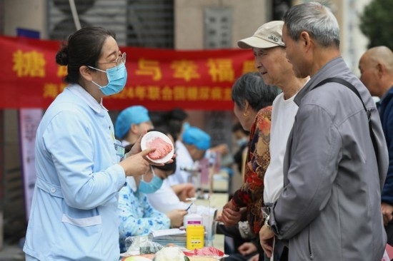 2024年11月14日在浙江省嘉興市南湖區(qū)南湖街道文星社區(qū),海警醫(yī)院護(hù)士為居民進(jìn)行健康飲食指導(dǎo)。新華社發(fā)(金鵬攝)