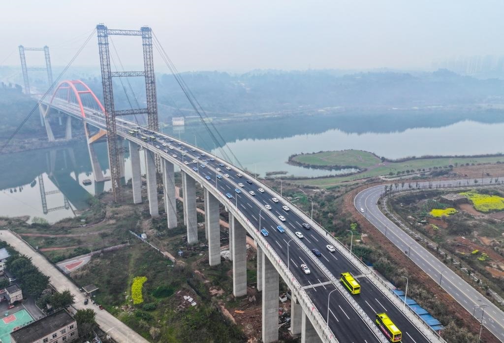 3月20日,車輛行駛在重慶潼南東升大橋上(無人機照片)。新華社記者 王全超 攝