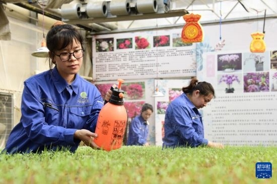 3月20日,在北大荒集團(tuán)黑龍江綏濱農(nóng)場(chǎng)有限公司溫室內(nèi),工作人員為孔雀草花苗補(bǔ)水。
