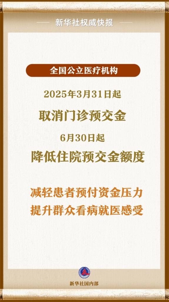 國家衛(wèi)生健康委、財政部、國家醫(yī)保局等6部門日前聯(lián)合印發(fā)《關于規(guī)范公立醫(yī)療機構預交金管理工作的通知》,要求公立醫(yī)療機構自2025年3月31日起全面停止收取門診預交金,自2025年6月30日起降低住院預交金額度。