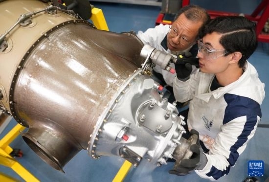在香港專業(yè)教育學院,黃富東(右)在檢查渦輪螺旋槳飛機引擎(1月14日攝)。新華社發(fā)(王申攝)