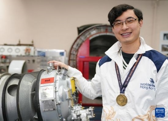 在香港專業(yè)教育學院,黃富東佩戴著“2024年里昂世界技能大賽”飛機維修項目的銅牌和渦輪螺旋槳飛機引擎合影(1月14日攝)。新華社發(fā)(王申攝)
