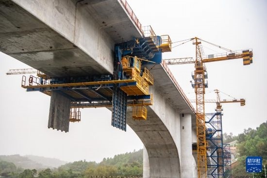 4月12日,工人在成渝中線高鐵玄天湖雙線大橋建設(shè)現(xiàn)場(chǎng)施工作業(yè)。