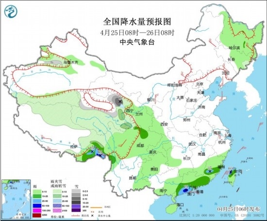4月25日08時至26日08時,新疆沿天山地區(qū)和南疆南部、西藏北部和東部、青海大部、甘肅南部、川西高原北部等地部分地區(qū)有小到中雪或雨夾雪,局地有大雪(5~8毫米)。西藏東南部、四川盆地西北部、云南西北部、福建中南部、廣東南部、臺灣島北部等地部分地區(qū)有中到大雨,其中,西藏東南部、廣東西南部、臺灣島西北部等地部分地區(qū)有暴雨(50~75毫米)。內(nèi)蒙古中東部、黑龍江東部、遼寧大部、江蘇南部、西藏南部、川西高原北部等地部分地區(qū)有4~5級風(fēng);東海大部海域、臺灣海峽有5~7級風(fēng),陣風(fēng)8級。
