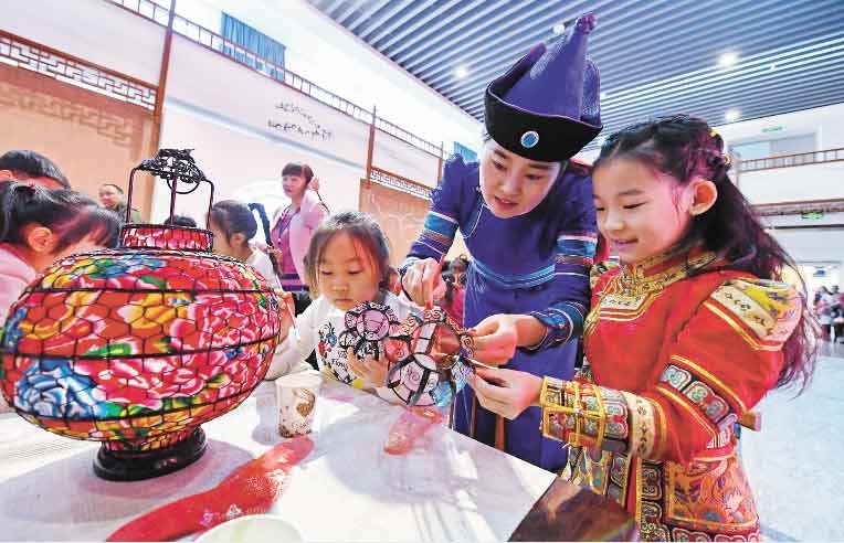 1月15日,小朋友們在非遺年貨展互動體驗區(qū)學(xué)習(xí)制作燈籠。當(dāng)日,“非遺過大年文化進萬家——2019年全區(qū)非物質(zhì)文化遺產(chǎn)年貨展”在內(nèi)蒙古展覽館舉辦,活動日期為1月15日至24日。本次展覽精選了與傳統(tǒng)年俗有關(guān)的近100個非遺項目進行集中展示,旨在推動非物質(zhì)文化遺產(chǎn)創(chuàng)造性轉(zhuǎn)化、創(chuàng)新性發(fā)展,促進文化脫貧攻堅,傳承和弘揚民族優(yōu)秀傳統(tǒng)文化,將非遺融入傳統(tǒng)新春佳節(jié),讓記憶里的濃濃年味在非遺傳統(tǒng)中鮮活起來。(內(nèi)蒙古日報社融媒體記者 王磊攝)