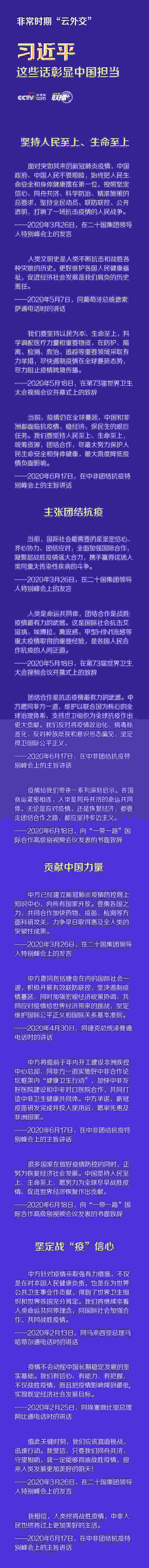 截至目前,習(xí)近平主席已經(jīng)同數(shù)十位外國領(lǐng)導(dǎo)人及國際組織負(fù)責(zé)人通話或見面,出席二十國集團(tuán)領(lǐng)導(dǎo)人應(yīng)對(duì)新冠肺炎特別峰會(huì),在第73屆世界衛(wèi)生大會(huì)視頻會(huì)議開幕式上致辭,主持中非團(tuán)結(jié)抗疫特別峰會(huì)并發(fā)表主旨講話等,開啟了以電話、書信、視頻為主渠道的“云外交”模式。