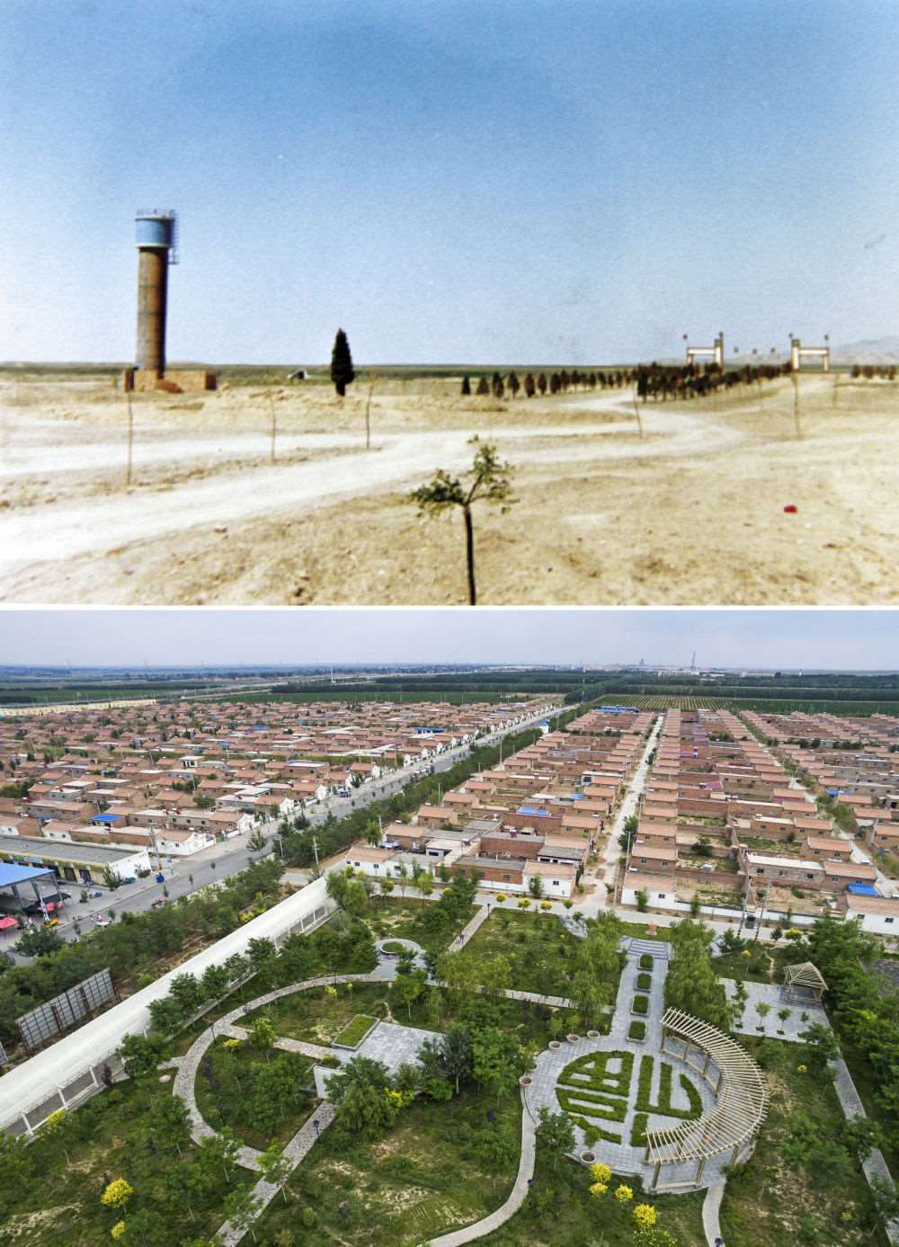 △上圖為寧夏永寧縣閩寧鎮(zhèn)建設初期的鄉(xiāng)鎮(zhèn)雛形;下圖為2016年7月22日拍攝的閩寧鎮(zhèn)原隆移民村。