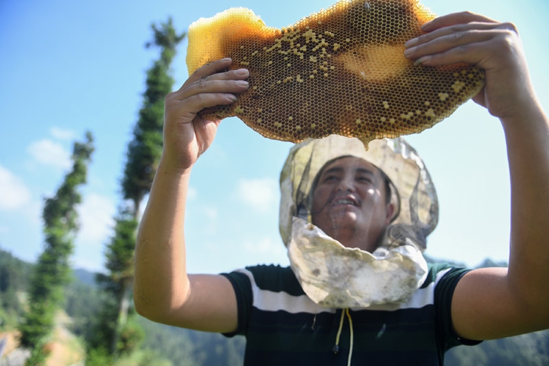 △十八洞村村民龍先蘭學習養(yǎng)蜂技術(shù),因地制宜發(fā)展養(yǎng)蜂產(chǎn)業(yè),逐漸成為養(yǎng)蜂大戶,還收獲了甜蜜的愛情。