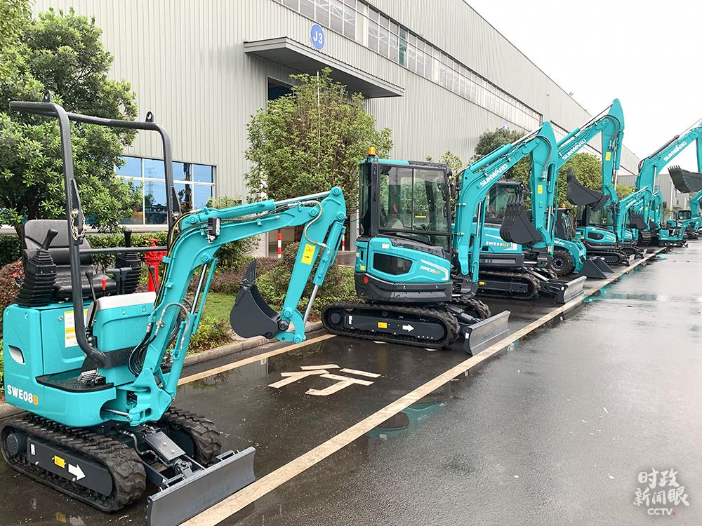△這是不同型號的微型挖掘機(jī),特點是動臂可偏轉(zhuǎn),底盤可伸縮,適合城市改造、農(nóng)田水利等小規(guī)模項目。(總臺央視記者章猛拍攝)