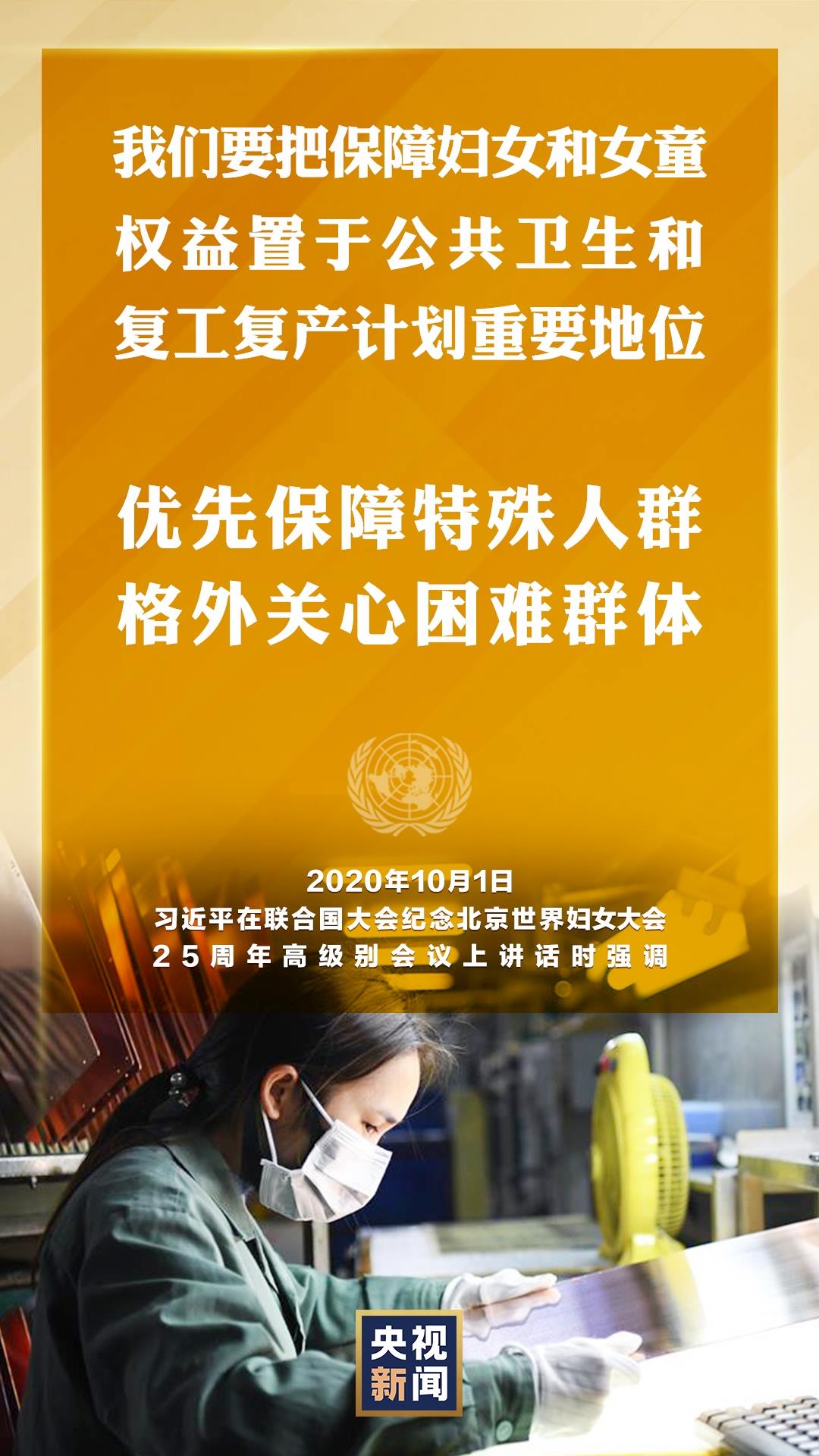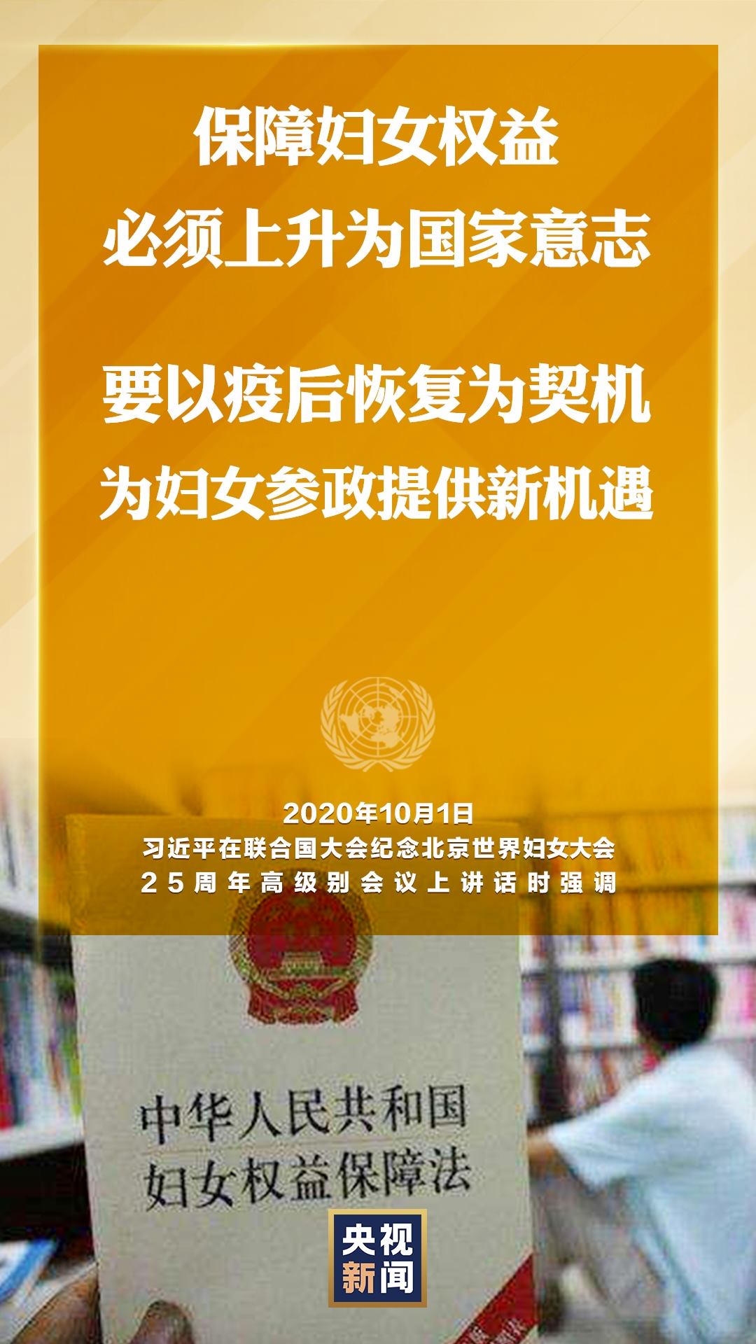 國(guó)家主席習(xí)近平10月1日在聯(lián)合國(guó)大會(huì)紀(jì)念北京世界婦女大會(huì)25周年高級(jí)別會(huì)議上通過(guò)視頻發(fā)表重要講話。就如何切實(shí)保護(hù)婦女權(quán)益,習(xí)近平提出中國(guó)主張。