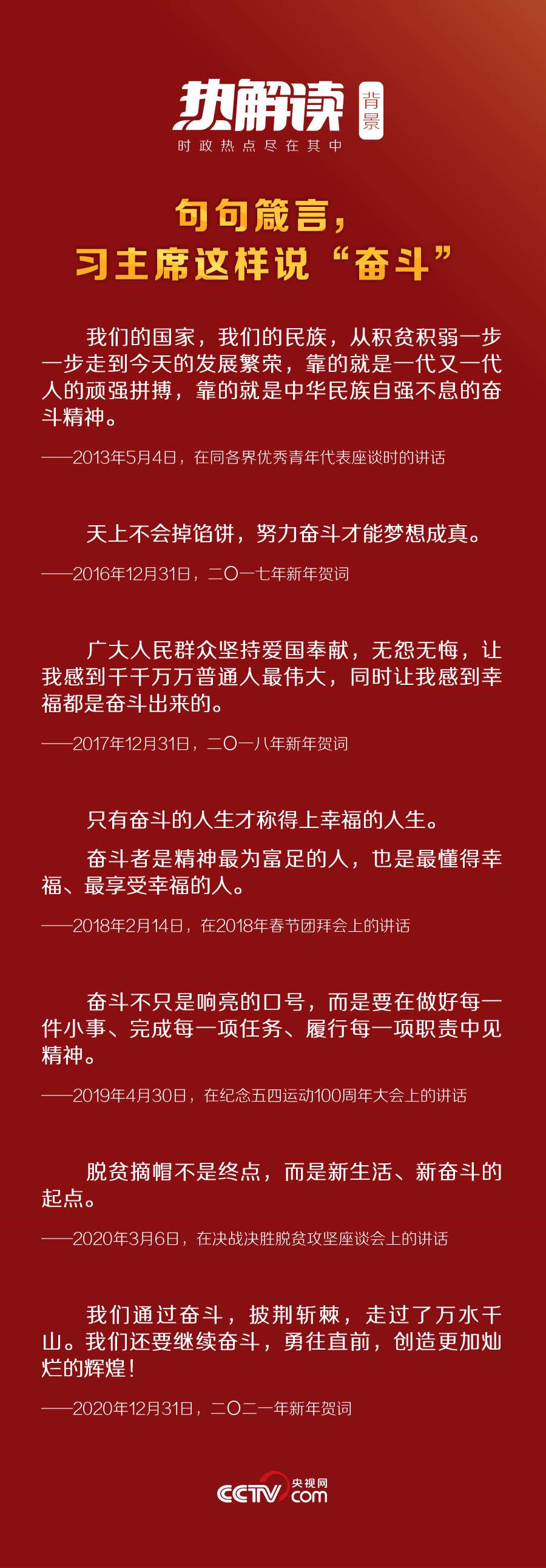 2020年,“十三五”圓滿收官,“十四五”全面擘畫;2021年,既是“十四五”開局之年,又是“兩個一百年”的歷史交匯點,全面建設(shè)社會主義現(xiàn)代化國家新征程即將開啟。在這個關(guān)鍵節(jié)點再次強調(diào)“奮斗”,習(xí)近平主席意蘊深遠(yuǎn)。