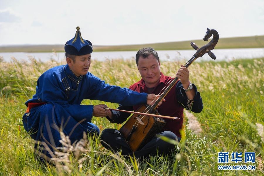 2018年9月13日,在內(nèi)蒙古自治區(qū)錫林郭勒盟鑲黃旗寶格達(dá)音高勒蘇木浩尼欽哈夏圖嘎查的一處草場,鑲黃旗烏蘭牧騎的隊員在為牧民演奏馬頭琴。新華社記者