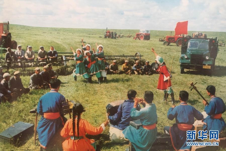 20世紀(jì)六七十年代,內(nèi)蒙古自治區(qū)錫林郭勒盟蘇尼特右旗烏蘭牧騎隊員在草原上為周邊牧民表演節(jié)目(資料照片)。新華社發(fā)