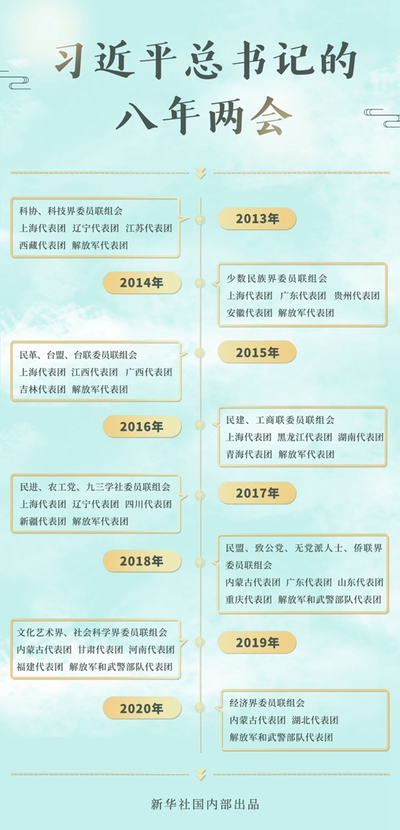 2013-2020,八年的全國兩會上,總書記46次到團(tuán)組參加審議討論。交流之中,語重心長;言談之間,發(fā)人深思。