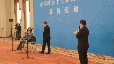 △首場“委員通道”活動上,中國美協(xié)主席范迪安推著中國殘聯(lián)主席張海迪退場。(總臺央視記者魏毅拍攝)