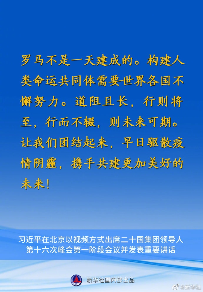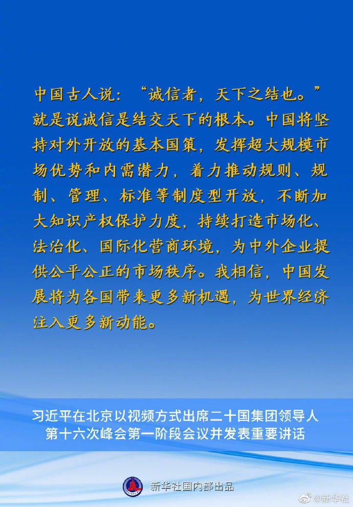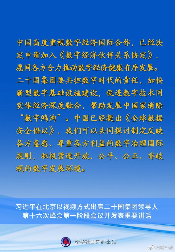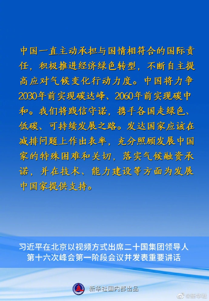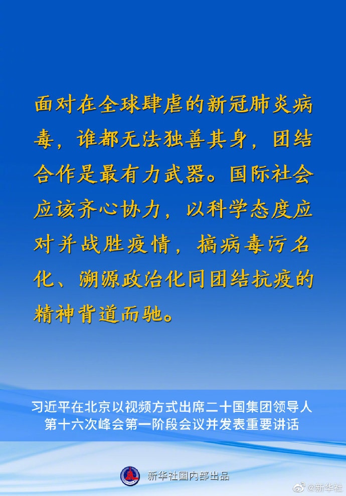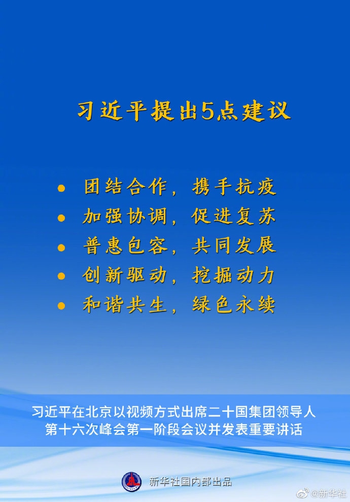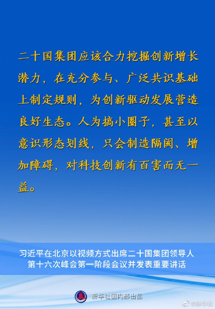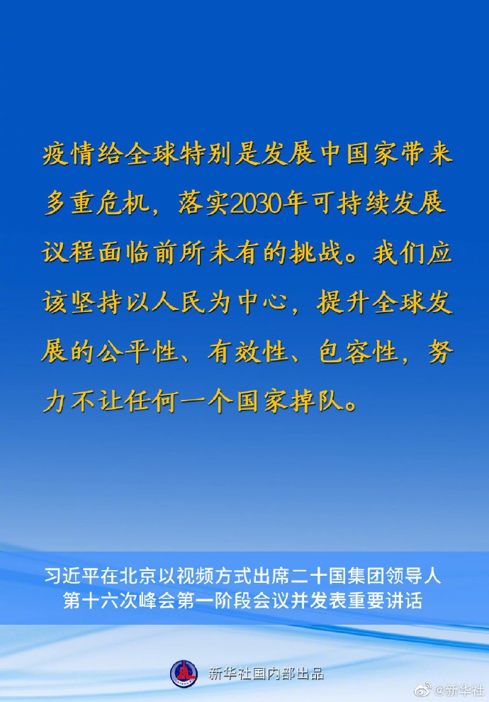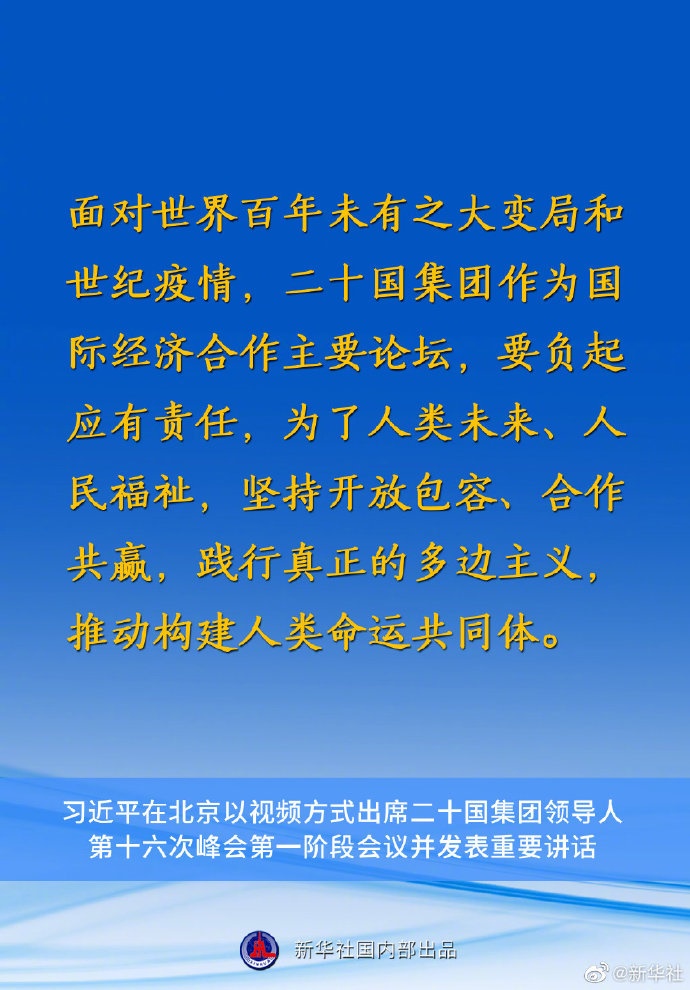 國家主席習(xí)近平10月30日在北京以視頻方式出席二十國集團領(lǐng)導(dǎo)人第十六次峰會第一階段會議并發(fā)表重要講話。講話有哪些要點,一起來看↓