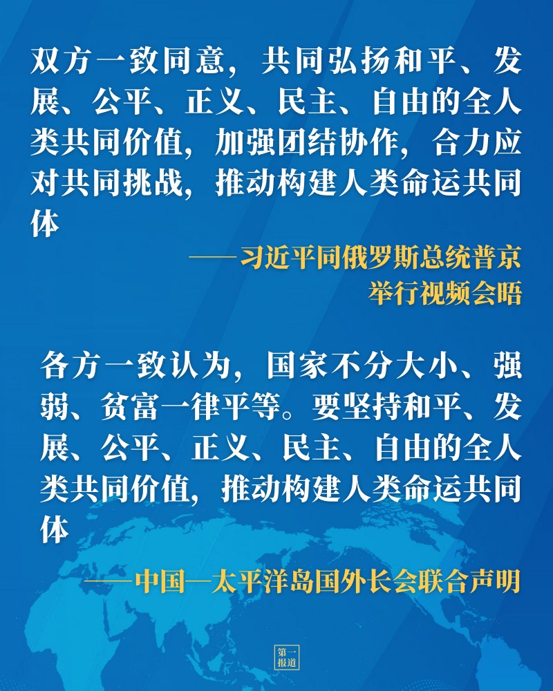 從同普京總統(tǒng)視頻會晤、同菲律賓總統(tǒng)杜特爾特通電話,到第七十屆聯(lián)合國大會一般性辯論、世界經(jīng)濟論壇“達(dá)沃斯議程”對話會、中國共產(chǎn)黨與世界政黨領(lǐng)導(dǎo)人峰會等多邊場合,習(xí)近平主席多次闡述全人類共同價值的深刻內(nèi)涵,凝聚中外共識。