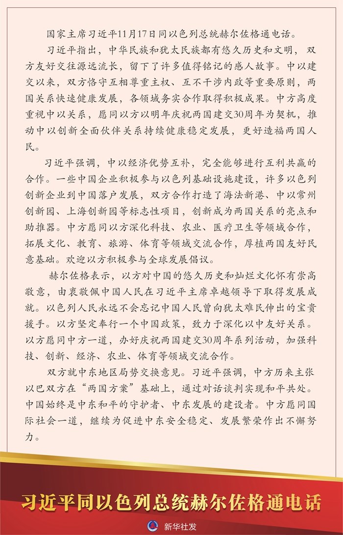 新華社北京11月17日電國家主席習(xí)近平11月17日同以色列總統(tǒng)赫爾佐格通電話。