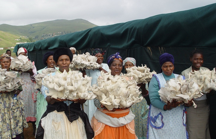 圖為2006年4月,南非一家菌草合作社的群眾展示收獲的菌草平菇。新華社發(fā)(國(guó)家菌草工程技術(shù)研究中心供圖)