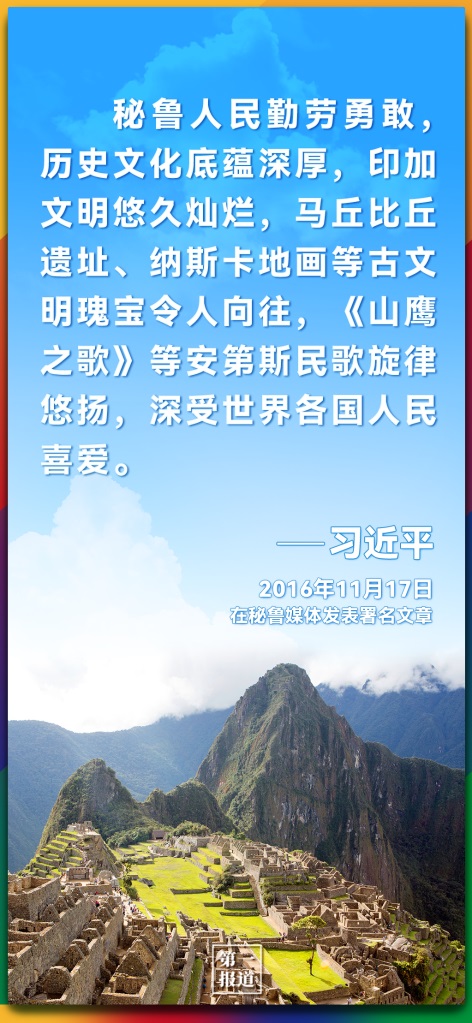 2016年對秘魯進行國事訪問期間,習近平主席在時任秘魯總統(tǒng)庫琴斯基的陪同下,出席了中拉文化交流年閉幕式。途中參觀《文明的長河——中拉文明互鑒》圖片展時,共同欣賞了中秘兩國樂隊一起演奏的中國民歌《沂蒙山歌》和秘魯民歌《山鷹之歌》。
