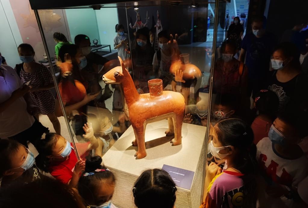 2020年7月4日,游客正在重慶中國三峽博物館觀看“失落的黃金國——安第斯文明特展”。該展以安第斯文明為主線,展出來自秘魯11家博物館的近200件套陶器、金器、紡織品等文物。