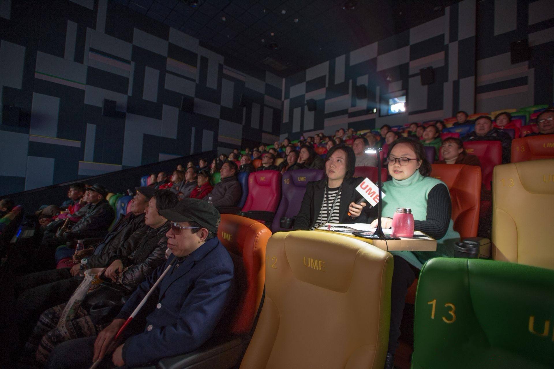 △杜誠誠(第二排右一)在青山一家商業(yè)影院中,為盲人居民講解正在放映的電影。