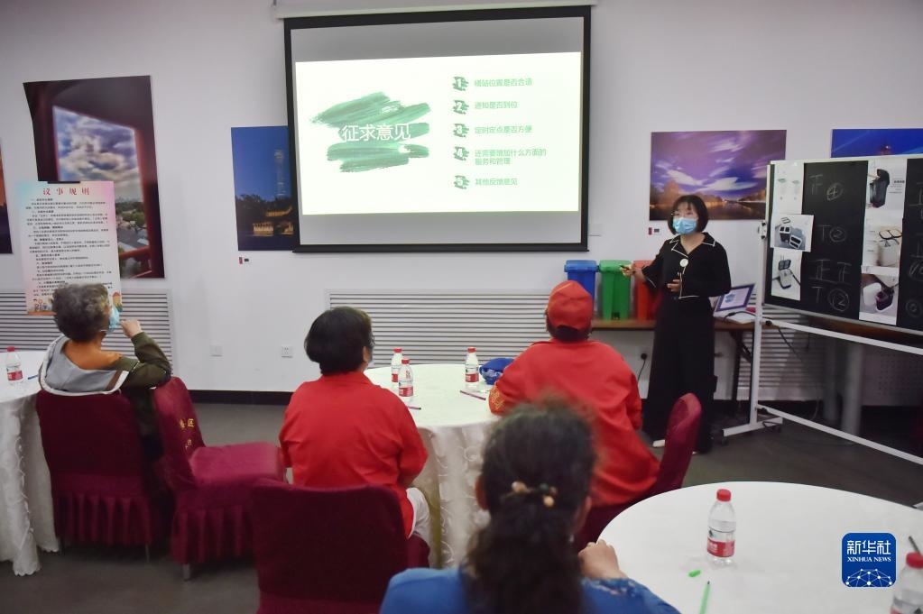 在北京建國門街道趙家樓社區(qū)議事廳舉行的“兩桶一袋”居民征求意見懇談會上,來自社區(qū)的12位垃圾分類達人對“兩桶”款式進行投票選擇,同時,街道針對桶站位置、定時定點投放等垃圾分類運營管理聽取居民意見(2020年5月2日攝)。新華社記者彭子洋攝