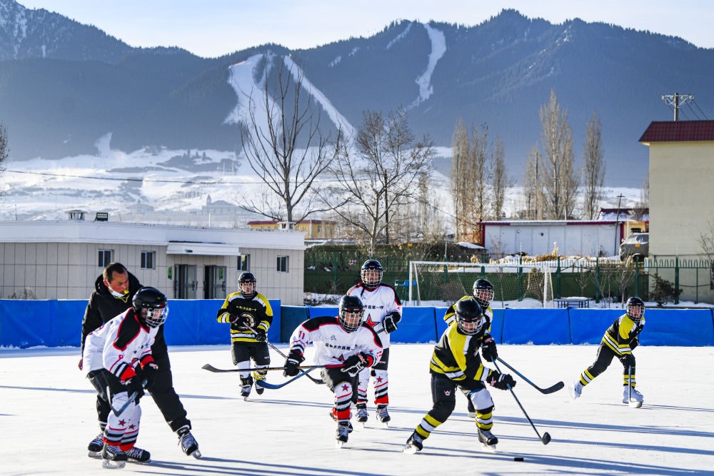↑新疆烏魯木齊市烏魯木齊縣第一中學(xué)小學(xué)部冰球隊(duì)的學(xué)生在進(jìn)行冰球比賽(2022年1月12日攝)。