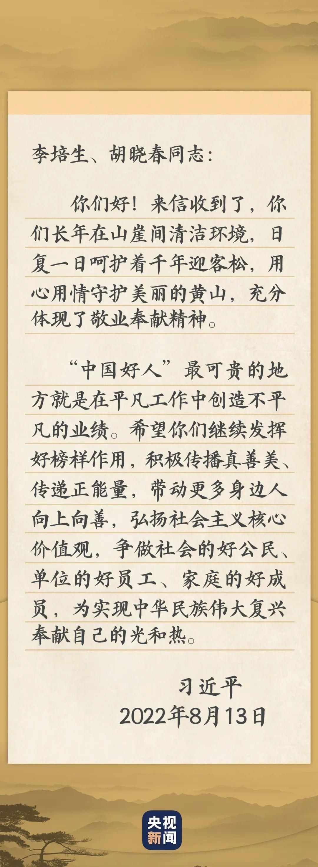 “真沒有想到習(xí)近平總書記給我們回信了,這份巨大的鼓舞不僅是給我們倆,也是給黃山的,更是給所有‘中國好人’的。”接到書信的李培生和胡曉春,前行的動力十足。