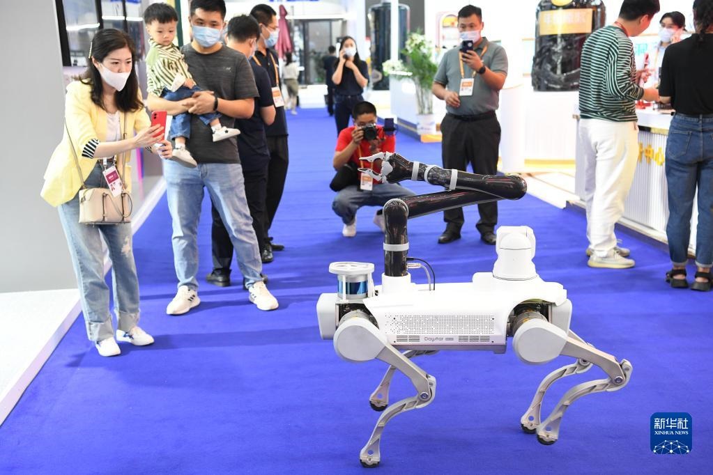 參觀者在安徽合肥舉辦的2022世界制造業(yè)大會上拍攝展出的一款四足巡檢機器人(2022年9月20日攝)。新華社記者 張端 攝