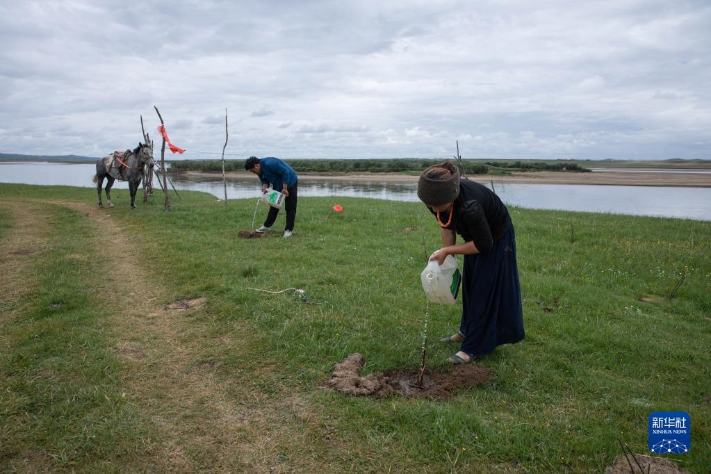 四川省若爾蓋縣麥溪鄉(xiāng)嘎沙村巡河隊的村民在黃河邊給新種的柳樹澆水(2022年7月26日攝)。新華社記者 江宏景 攝