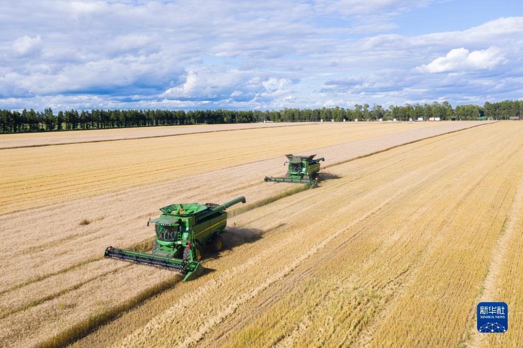 聯(lián)合收割機在黑龍江北大荒集團紅星農(nóng)場有限公司田間收獲小麥(2022年8月10日攝,無人機照片)。新華社記者 謝劍飛 攝