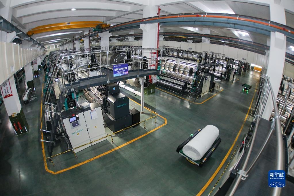 福建晉江,華宇錚鎣集團第五經(jīng)編車間內(nèi),一排排經(jīng)編機正在高速運轉(zhuǎn),AGV物流機器人不停穿梭其中。