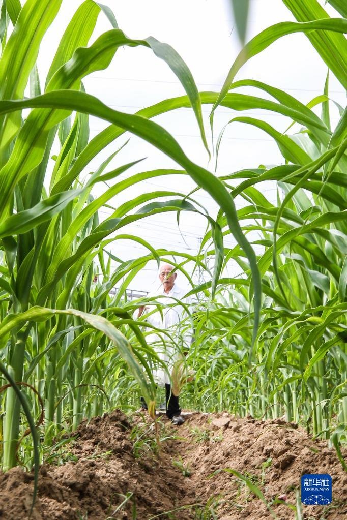 玉米育種專家程相文在海南三亞南繁科研育種基地觀察玉米生長情況(2022年12月15日攝)。新華社記者 張麗蕓 攝