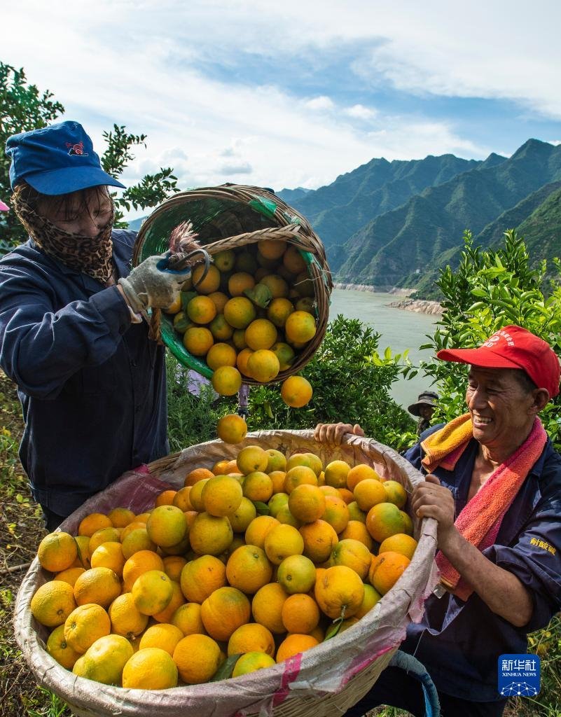 湖北省宜昌市秭歸縣沙鎮(zhèn)溪鎮(zhèn)臺子灣村村民在柑橘園里轉(zhuǎn)運(yùn)夏橙(2022年6月21日攝)。新華社發(fā)(鄭家裕 攝)