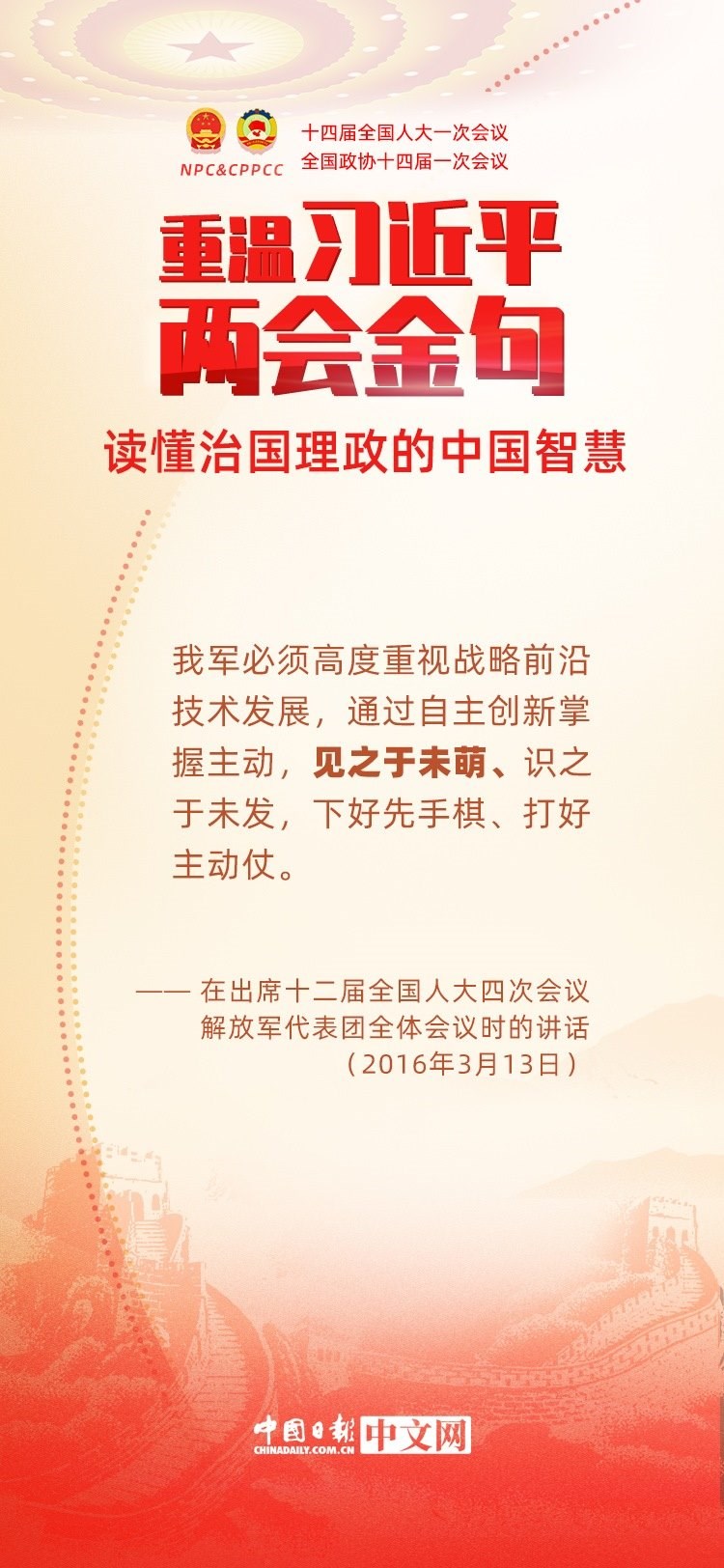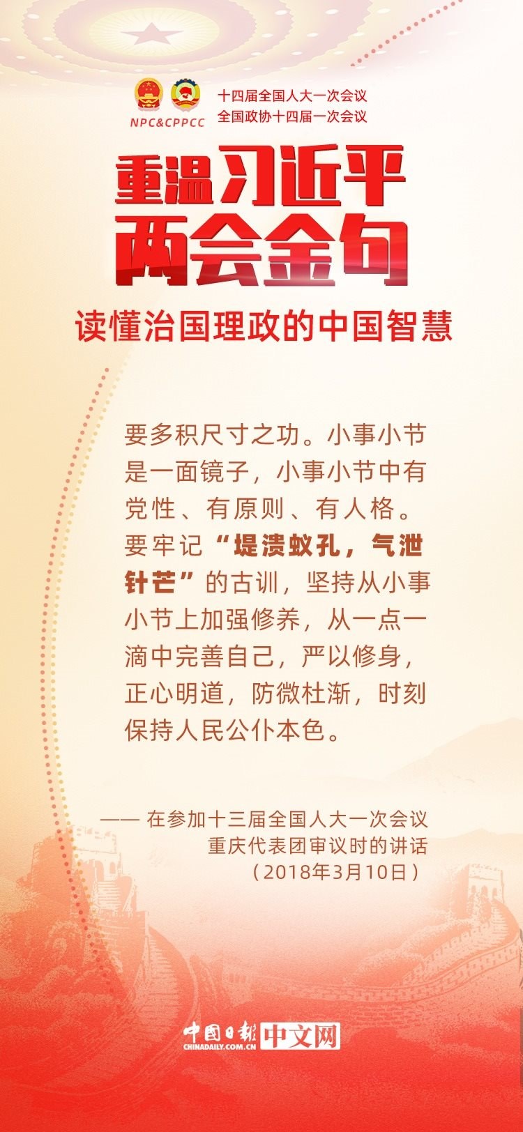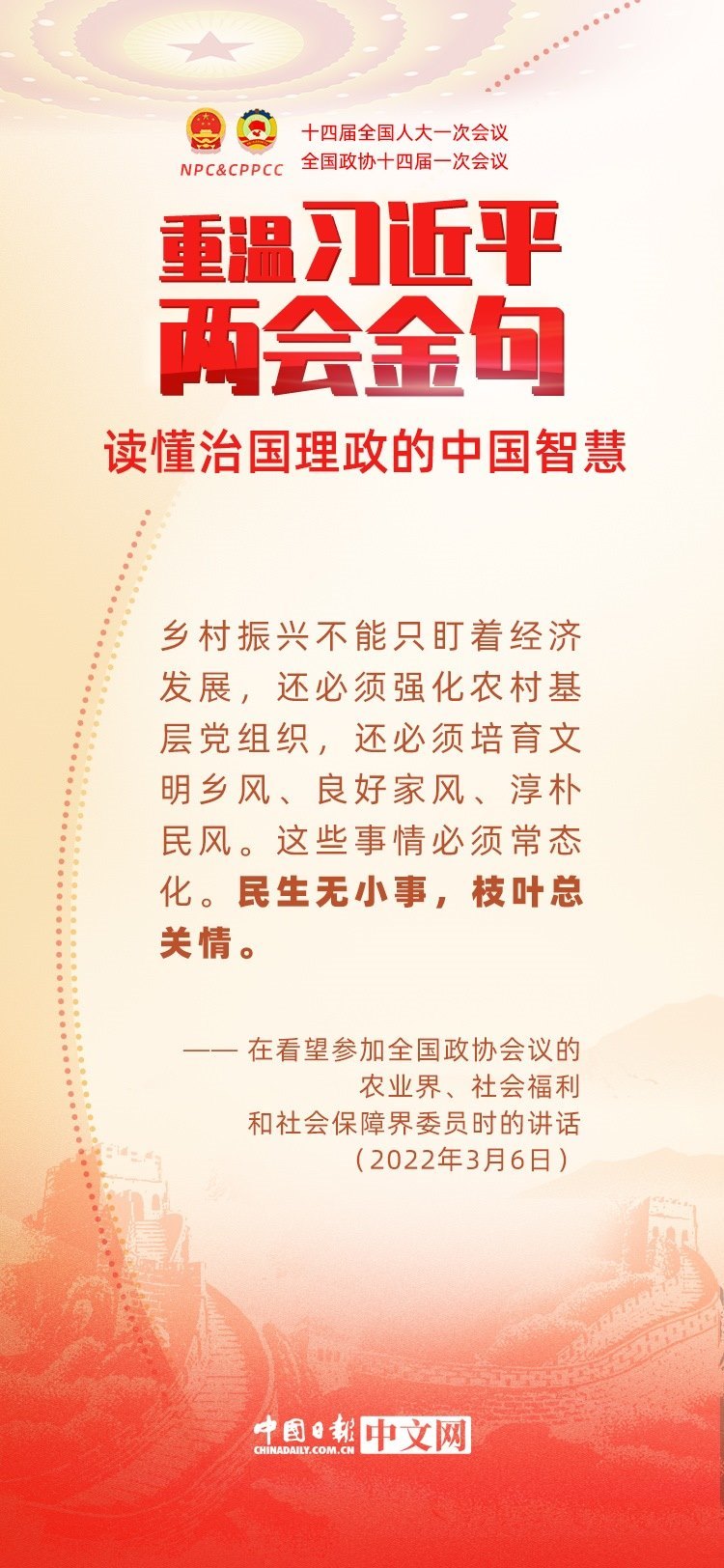 黨的十八大以來,每年兩會期間,習近平總書記都要與代表委員共商國是。十年來,在一系列重要論述中,習近平總書記使用詩詞、古語等典故,把中華優(yōu)秀傳統(tǒng)文化融入治國理政的理論和實踐中。