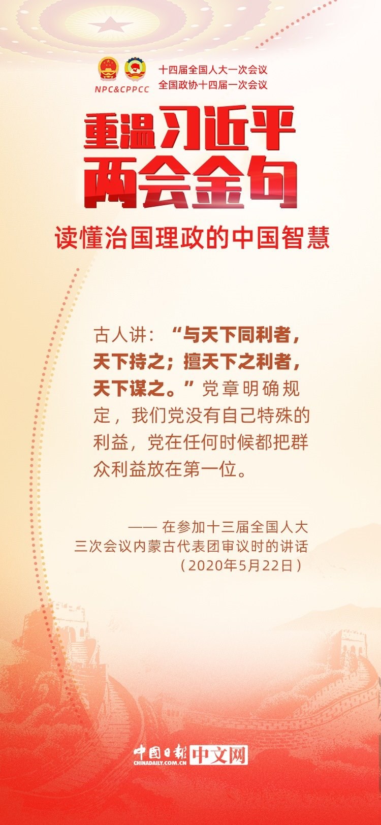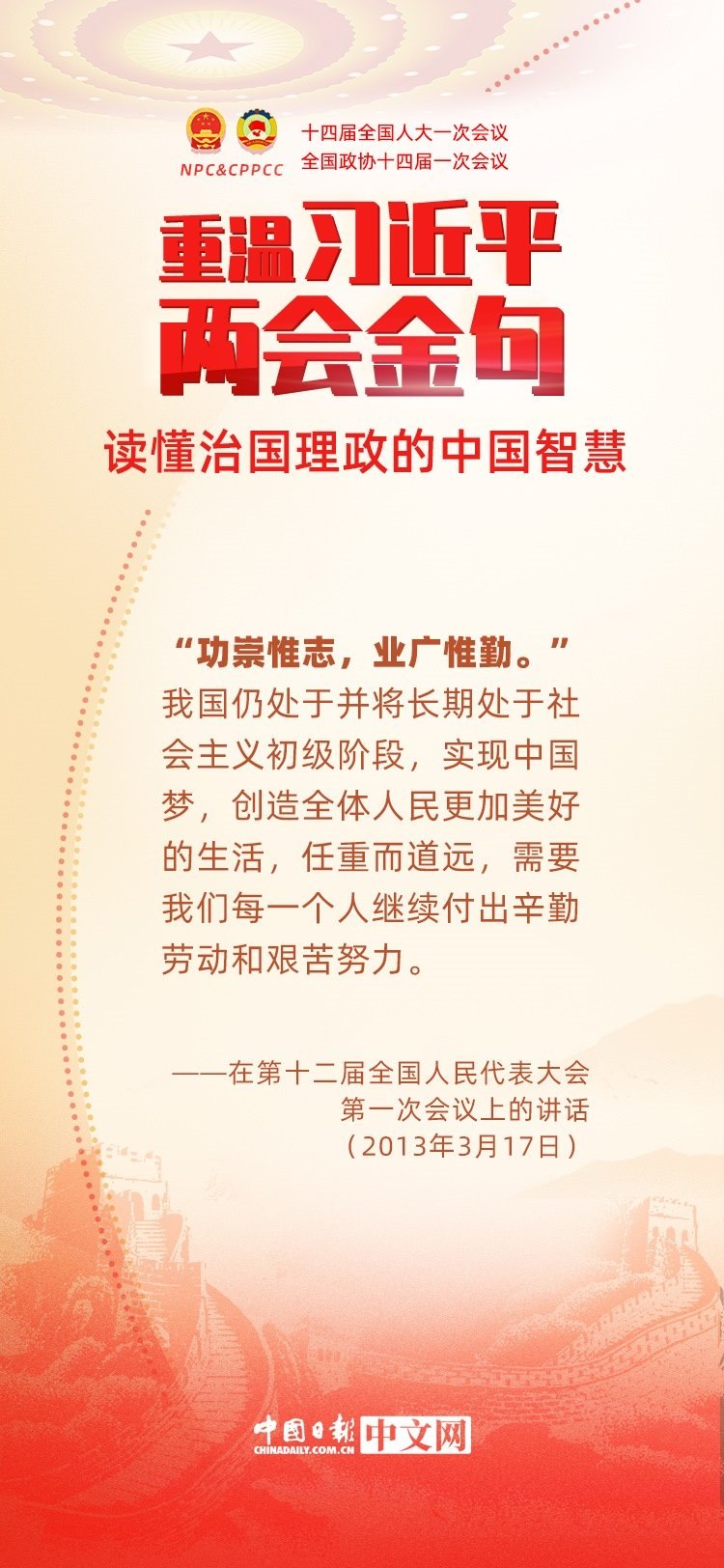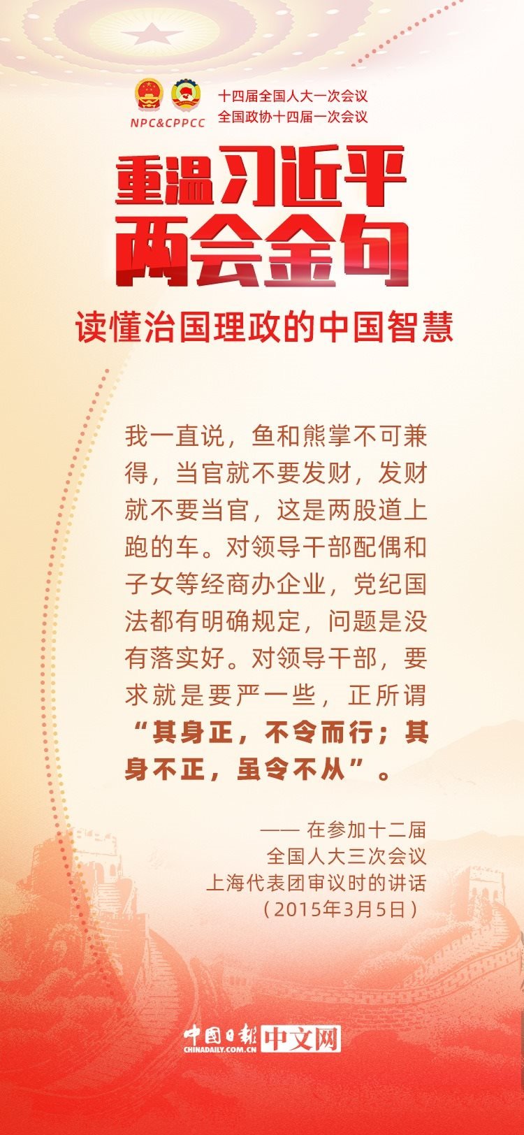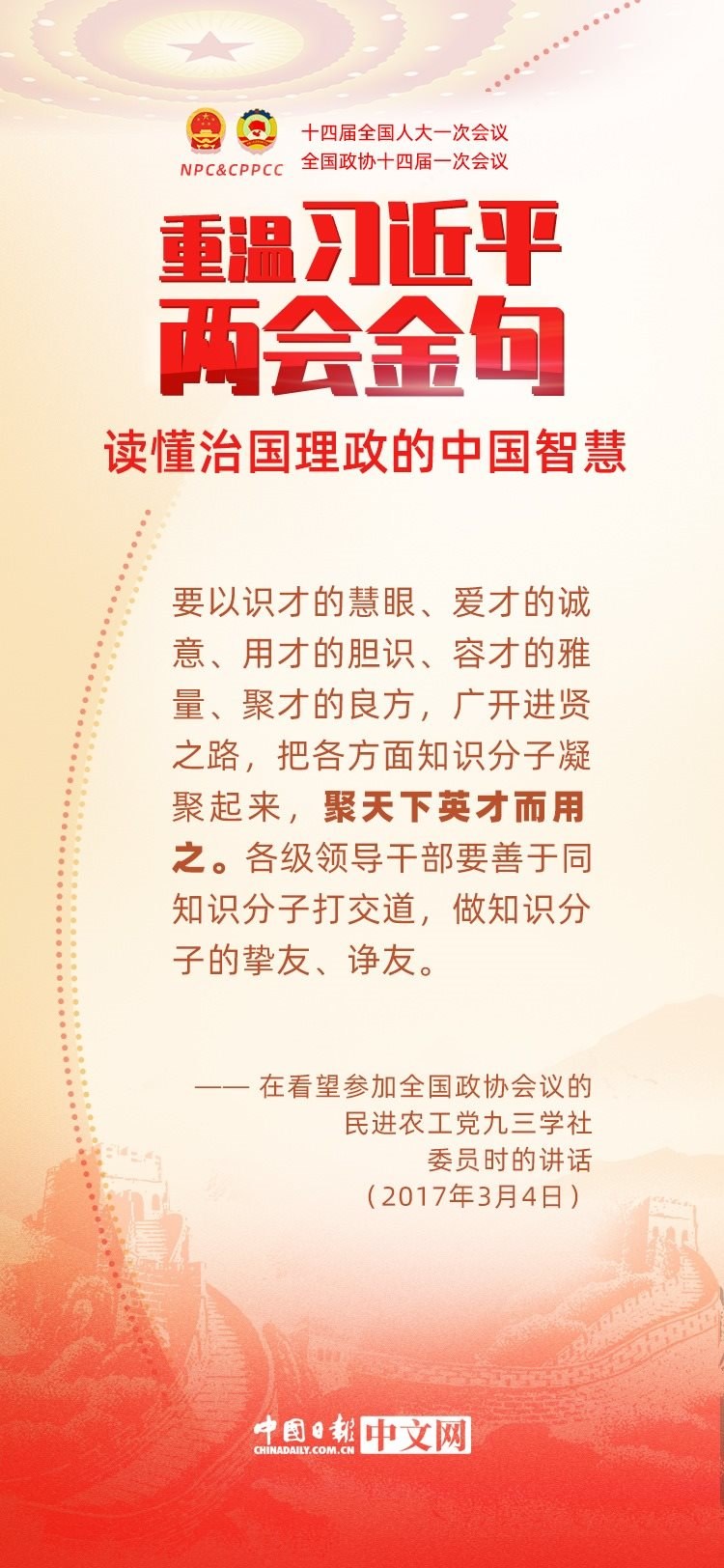 黨的十八大以來,每年兩會期間,習近平總書記都要與代表委員共商國是。十年來,在一系列重要論述中,習近平總書記使用詩詞、古語等典故,把中華優(yōu)秀傳統(tǒng)文化融入治國理政的理論和實踐中。