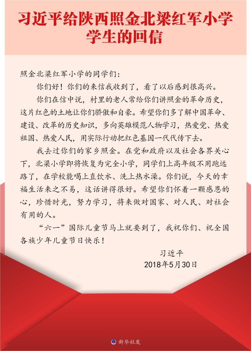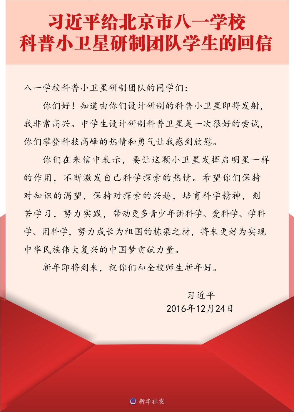 北京市八一學(xué)校是習(xí)近平總書記的母校。2016年底,八一學(xué)校的學(xué)生們給習(xí)近平總書記寫信,報(bào)告了他們參與設(shè)計(jì)研制的科普小衛(wèi)星即將發(fā)射的消息。很快,孩子們收到了總書記的回信。