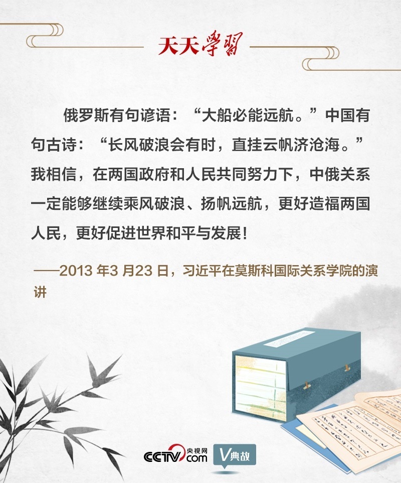 關(guān)于中俄關(guān)系,早在10年前在莫斯科國際關(guān)系學院的演講中,習近平主席就有精辟闡述。演講結(jié)束語中,習主席首先引用一句俄羅斯諺語“大船必能遠航”,拉近了與俄羅斯民眾的文化空間和心理距離。接著引用了含義相近的中國古詩“長風破浪會有時,直掛云帆濟滄?!?,讓對方在文化相似性中深刻領(lǐng)悟其中道理。最后凝聚共同理念:“中俄關(guān)系一定能夠繼續(xù)乘風破浪、揚帆遠航”。