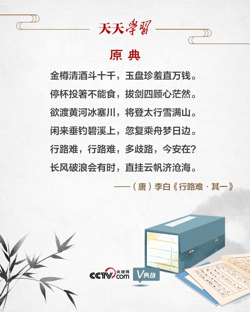 “行路難”為樂府古題,多詠嘆世路艱難及貧困孤苦的處境。李白的《行路難》共三首,“長風破浪會有時”出自第一首。唐天寶元年(742年),李白奉詔入京,擔任翰林供奉。后因權(quán)臣讒毀排擠,被“賜金放還”。《行路難》便是李白離開長安時所作。